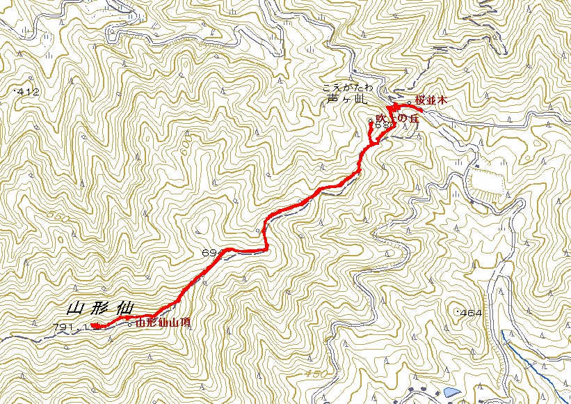 トップに戻る 2015年に登った山リストへ戻る 山名アイウエオ順 2015年4月17日 声ヶ乢 →0:07→ 吹上の丘 →0:45→ 山形仙山頂 →0:03→ 三角点 →0:35→ 声ヶ乢 全歩行時間 1時間30分 矢筈山の登山口の千磐神社を出発、次は山形仙の登山口の声ヶ乢へ向かう。この声ヶ乢は以前那岐山から滝山を経て広戸仙へ縦走した際に下山した場所で、当時はこの声ヶ乢へタクシーを呼び、那岐山の登山口まで引き返した思い出の地である。