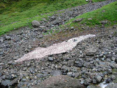 谷には上流から流れてきた大小の岩が堆積し、まるで岩海のような景観を見せており、注意して周囲を見回せば、岩海の端には小規模ながら雪渓が残っていた。周囲はお花畑のようだが、花の季節は過ぎてしまったようだ。足下は岩の点在する滑りやすい状態で、急な坂も続いていおり、ゆっくり歩きが続く。