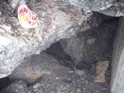 岩に書かれた案内に従い、岩海を登ればすぐに播隆窟へ到着、案内には「槍ヶ岳初登はん・開山をなしとげた念仏行者播隆が、そのつど利用した岩屋。播隆行者は、五回槍ヶ岳登山をしたが、天保五年(1834)の第四回登山の時は、この岩屋で五十三日間も篭もり、念仏を唱えた」と説明されている。