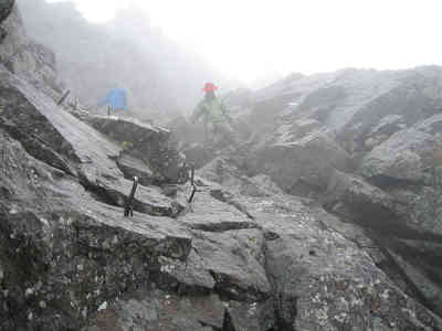 悪天候の槍ヶ岳 岩場を登る山ガール 一つ一つの岩の安全を確認しながら慎重に高度を上げる。いわゆる三点確保で確実に安全に岩を選びながら進む。周囲は霧の中なので全く展望はない。従ってそんなに恐怖を感じることなく登っている。間もなく最初の難関のハシゴ前に到着、ほとんど垂直のハシゴを一気に登る。これはなかなか楽しい作業である。
