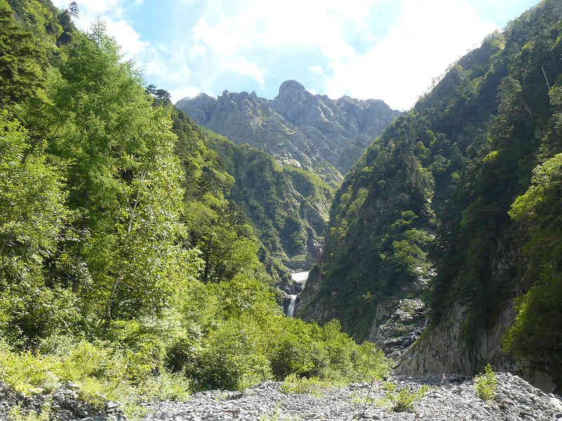 もう少し進むと大きな河原に出る。岩の多い河原から南東方面の展望が広がり、正面には落差の大きそうな滝がある。滝の上には雪渓が白く、稜線には坊主頭のような丸っこい形の山があり、美しい景色に声を失う。位置からすると北穂高岳のようだが、やはりこの付近の地理には疎い。