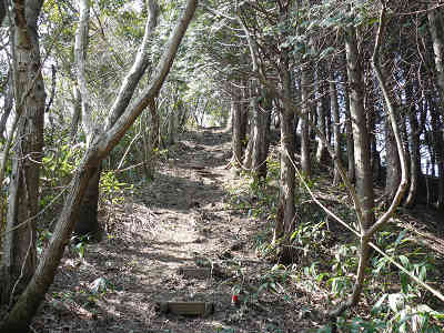 周囲には落葉の自然林が続き、明るく気持ちの良い道である。進路は右方向へ緩やかなカーブを描き、やがて左方向へ軌道修正をする。木の間越しながら北方面には山頂が見えてきた。更に進めば右側の植生が植林帯へ変わるが、左側は依然として自然林が続く。