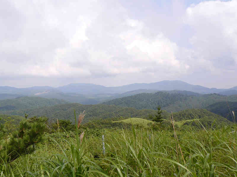 避難小屋から西の展望 避難小屋を出発し、更に南西方面に向かって進んで行く。右手に大きな岩を過ごし、足下に美しい花を観賞しながら散策を続けている。この道は晴らしい散歩道のようだ。ブナ林まで1.5kmの標識を過ごすと周囲には松の木が美しく、吹きさらしの草原の中で背の高い木はこの松だけのようだ。