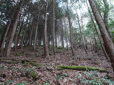 この植林帯の中に入り、沢に沿って進むが歩き難いので、左岸の上を辿る。進路には笹が目立つため笹を分けて進む。足下が不安定なので慎重に歩を進めるため時間がかかる。