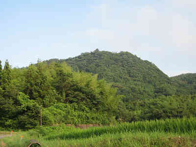 登山口から少し下りた場所より横山城跡を振り返ると、山頂で旗が風になびいている。やはり一旦山頂に立ち、山頂の状況が分かると麓からもその山頂をすぐに確認できることが分かった。
