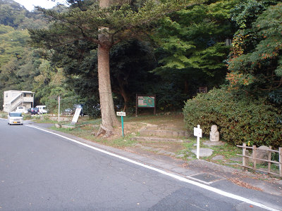 案内に従い階段へ向かう 頂上、内膳丸跡登り口の案内を見て、苔むす石段へ向かう。要所には頂上登り口の案内があり、道に迷う心配は無いし、少々周囲が暗くても安心して登ることができる。すぐに丁字路へ着き、丁字路の手前右には中海展望所への分岐が続いていた。 丁字路では左に内膳丸、右に本丸跡、二の丸跡と案内されている。ここでは内膳丸へ立ち寄ってみた。分岐を左(北)に採り、石段を登れば広い内膳丸跡へ到着。内膳丸跡から山頂方面を眺めてみたが、こんもりした森が見えるだけで、山頂部を確認することはできなかった。