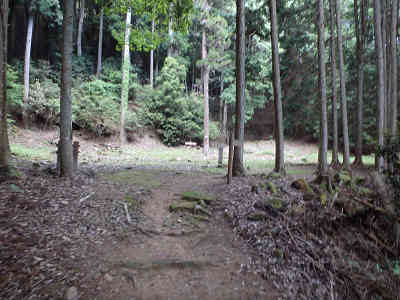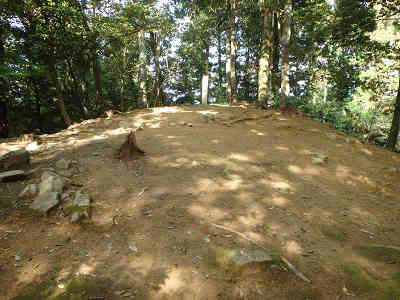 一段高い山頂へ着けば、御本丸跡の石柱とその後には標高点の名残のような石柱が置かれていた。山頂周囲は木々に覆われて全く展望はない。山頂を出発し、次は本丸の東に位置する三の丸を散策してみる。三の丸は城内で最大の曲輪で、曲輪内は土塁や削り出し等によりさらに4段に分かれている。これで本丸周辺の散策が終了したので下山を開始する。