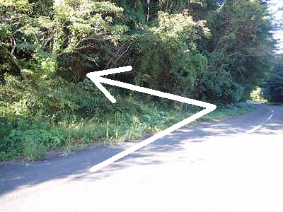 この付近から折り返すように左側へ続く山道に入るが、入口付近は最初から草が茂り少し躊躇。ただし歩き始めれば踏み跡が続いているので歩行に支障は無い。少し進んで右側の尾根に取り付けば良かったかも知れないが、踏み跡は更に続いているのでそのまま進むと植林帯に着いた。