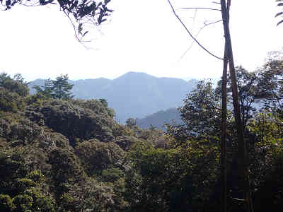 更に進むと鼓ヶ岳へ続く縦走路に入り、これで無事快適な道を進むことができる。樹間越しに向かいに見える景色を眺め、古い目印テープに従い尾根道を進む。尾根上を広い道が続いているので何も苦労することは無く、時折地図を眺め、後は目印テープを目で追えば良い。