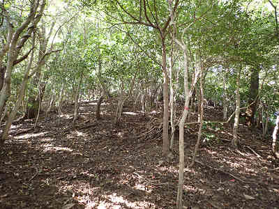 植林帯を抜けたところで前方がヤブになったので、そのまま突き進むと道が違っていた。正しいのは右上の尾根へ続く道だが登った形跡が無い。そのまま尾根方向へ向かってヤブへ突入、少し辛抱して登れば樹林の下に着き、急に歩きやすくなった。