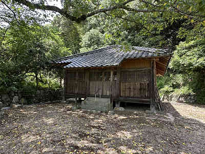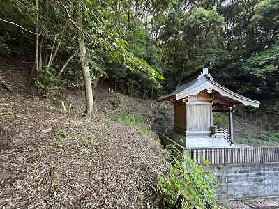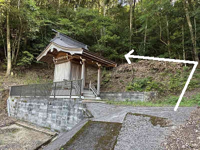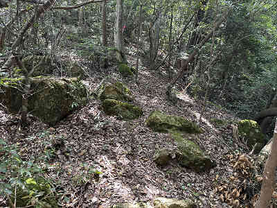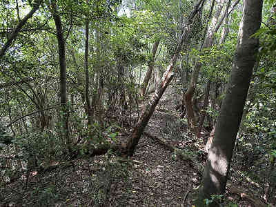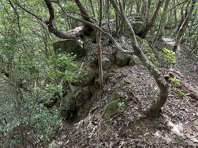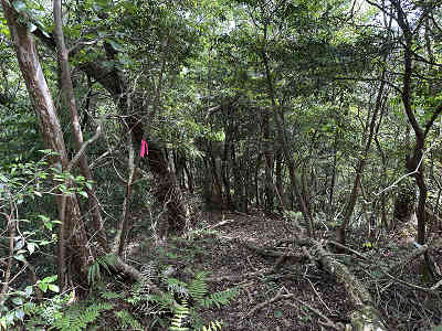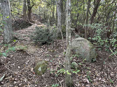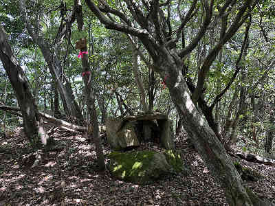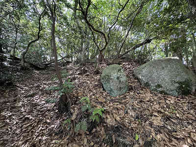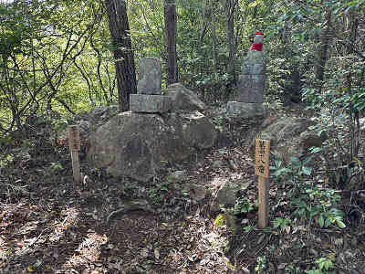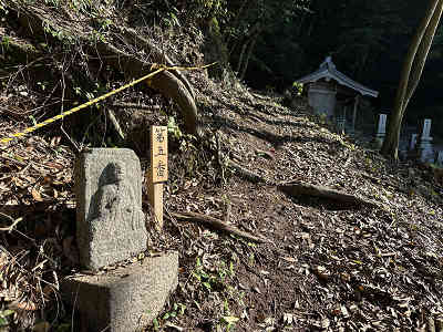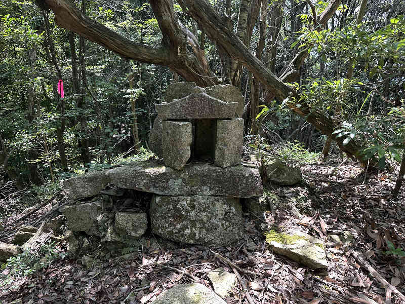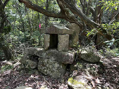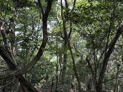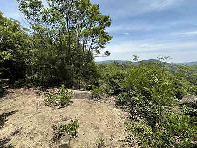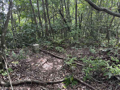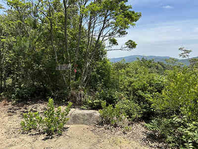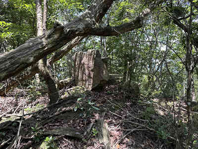 自然林が続く登山道を淡々と進み、岩が目立つ場所を通過すると、この先に祠が祀られた場所に着きました。しかし、この祠の中は空っぽでした。祠の横を通過し、わずかに坂を下って登り返すと、標高445mの高嶽山頂です。高嶽山頂にも祠が祀られていましたが、こちらも中は空でした。