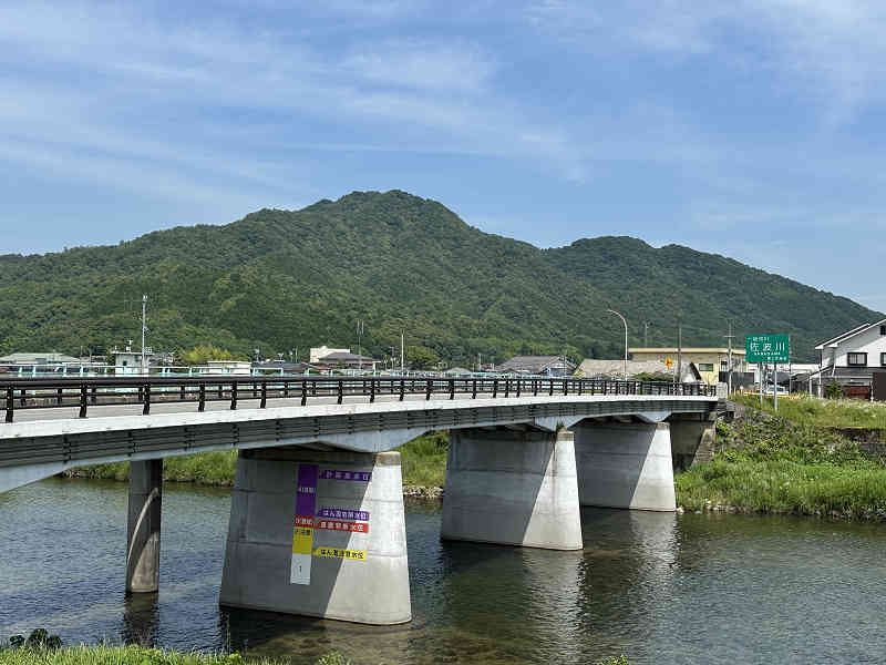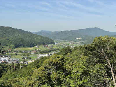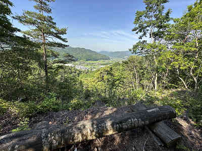 絶景と心地よい木漏れ日 美しい木漏れ日が降り注ぐ道を歩いていると、42番石仏の先で展望地に出ました。眼下には佐波川が流れ、西から南西方向には真田ヶ岳や右田ヶ岳などの山々が広がっています。以前見えていた狗留孫山や白石山は、残念ながら木々の成長で全く見えなくなっていました。展望地には休憩用の丸太の椅子も設置されています。