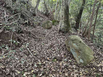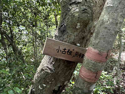 わずかに集落が見える場所を過ぎ、よく踏み固められた登山道上では「村」と彫られた石杭を見かけました。少しずつ高度を上げていくと、途中に転がる岩が現れます。時折倒木も見られましたが、歩きやすいように片付けられていました。