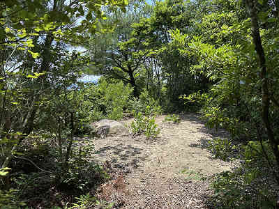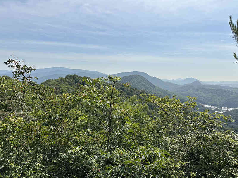 高嶽の山頂周囲には岩が多く、どこか神聖な雰囲気が漂っています。ただ、山頂周囲は樹木が高く、残念ながら展望は望めませんでした。山頂を出発し、手前の祠まで引き返して明るい祠の前で小休止をとり、下山を開始しました。