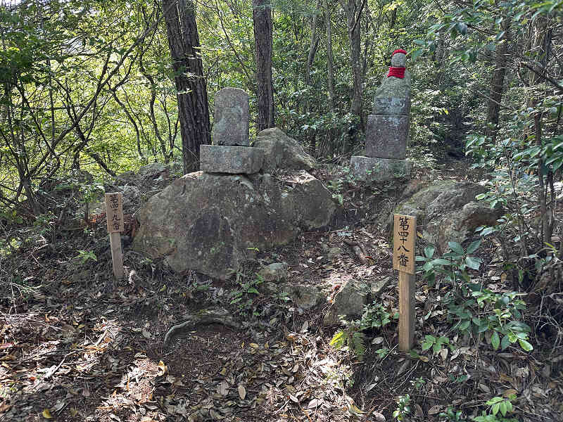 無事に巡礼と登山を終えて 要害岳まで引き返し、地図で山名を確認したり、双眼鏡で山頂に建つアンテナなどを眺めたりしてから、要害岳を出発しました。48番・49番札所まで戻り、50番からお大師様巡りを再開です。この先からは急な下り坂が続き、補助のロープを伝いながら慎重に下っていくと、下り立った場所は薬師堂でした。