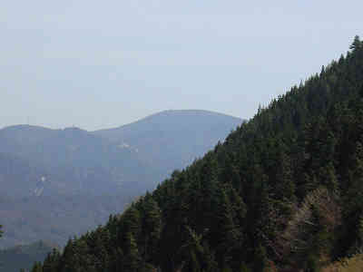 ピークから急な坂を降りて行くと鞍部に到着、左側の下の方を見ると目印の赤いテープが見えた。蒲鉾板のような道標が掛けられており、どうやらここが木目の滝への降り口らしい。少し坂を登ると尾根道が狭くなり、尾根の右側を歩くがすぐ下が急斜面であり、滑らないように歩いて行く。木の間越しに特徴のあるレーダードームの羅漢山が見えた。再び一旦坂を降りると、台風による倒木帯を過ぎる。