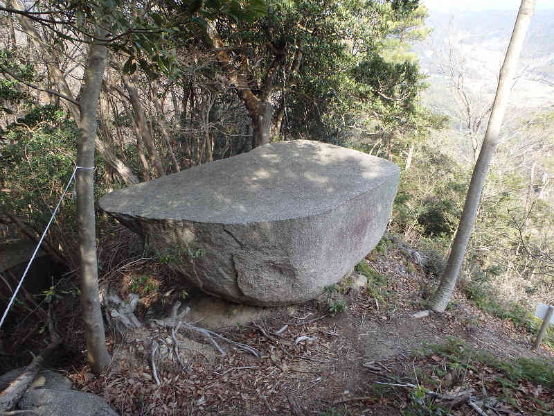 落葉の堆積した急な坂へ向かえば、シダの目立つ場所を通過する。滑りやすい急斜面を慎重に登ると周囲の樹林の伐採された場所へ着く。右上を眺めると舟形の石が据えられており、これが天狗の足跡と呼ばれる石である。この石を上から眺めると、人工的に切られたように表面が水平であり、とても不思議な石である。 天狗の足跡付近から眺める風景(クリックで拡大) 天狗の足跡付近からは眼下に湯野地区の街並みが一望、北東には特徴的な山容の千石岳がそびえている。また、南には瀬戸内海、南東には瀬戸内海沿いに周南コンビナートも見えており、天狗の足跡付近は周南市の市街地などを見下ろす展望地である。 天狗の足跡を出発、進路を西へ採る。明るい自然林の下、少し高度を上げると天保5年(1834)の杵崎大明神の石祠跡へ到着、この少し下には役行者の石仏が大岩に彫られていた。杵崎大明神を出発すれば、緩やかな傾斜の尾根道歩きが続く。