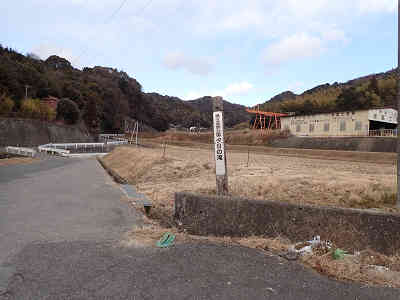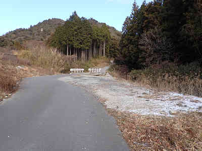 観音堂の先の左側に駐車場を過ごして坂を直進、 すぐに左側へ続く道に入る。わずかに坂を下れば丸太を6本横に並べた橋が架けてあり、橋を渡れば平坦なところにベンチが置かれていた。