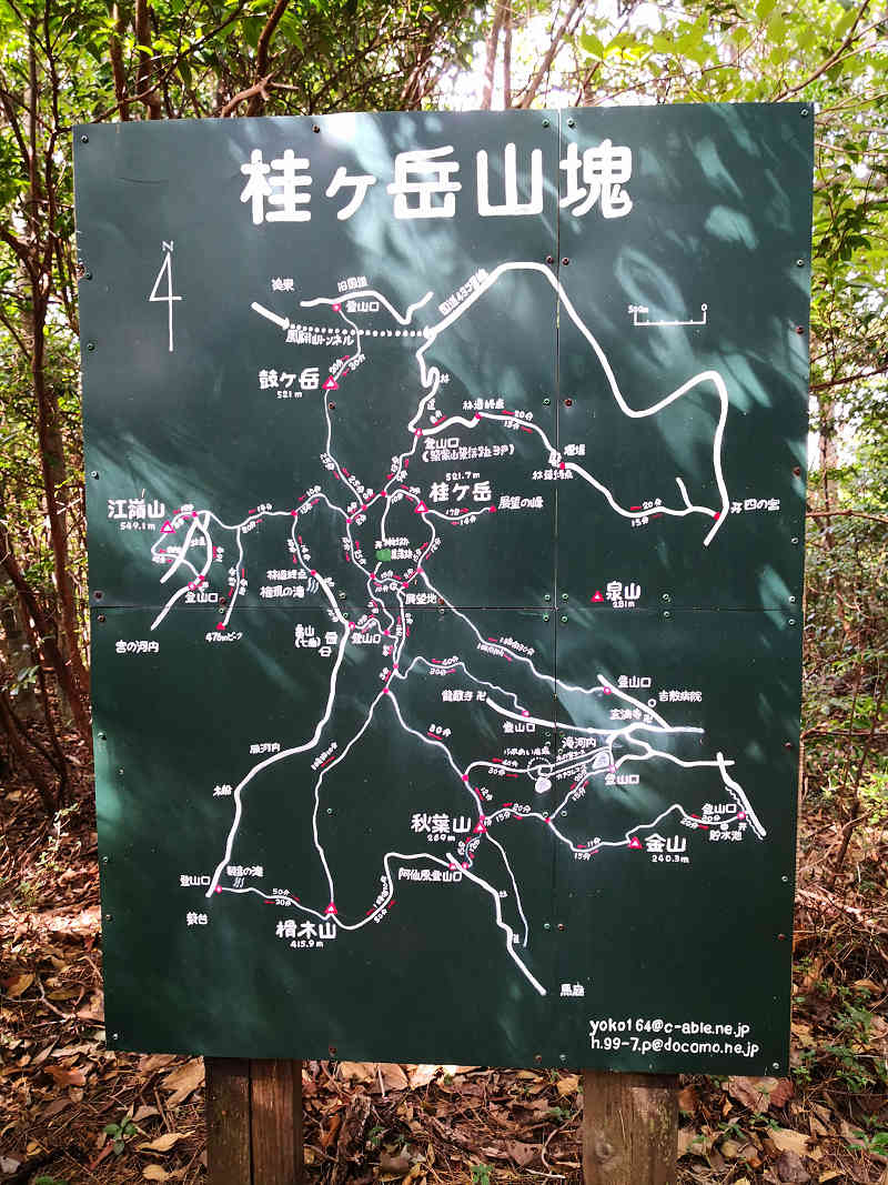 足下には角の欠けた三角点を確認、山頂の木には江嶺山の山頂プレートが二つ掛けてあった。山頂で冷たい水分を補給し、おむすびをほおばる。カップヌードルを食べたりコーヒーを飲む時間ももったいないので休憩の後すぐに江嶺山を出発、桂ヶ岳への分岐まで引き返した。なお、引き返す際には道に迷うこと無く、それこそ快調に引き返すことができた。江嶺山からは53分で引き返したので少し心の余裕ができた。さて、次は桂ヶ岳へ向かう。